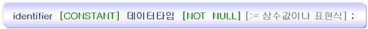 -- 숫자형 상수 선언(변할 수 없다) v_price CONTANT NUMBER(4,2) := 12.34 ; v_name VARCHAR2(20) ; v_Bir_Type CHAR(1) ; -- NOT NULL의 TRUE로 초기화 v_flag BOOLEAN NOT NULL := TRUE ; v_birthday DATE;