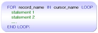 FOR문을 사용하면 커서의 OPEN, FETCH, CLOSE가 자동 발생하므로 따로 기술할 필요가 없고, 레코드 이름도 자동 선언되므로 따로 선언할 필요가 없다.