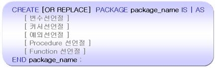 • - 선언절은 패키지에 포함될 PL/SQL 프로시저나, 함수, 커서, 변수, 예외절을 선언 한다.