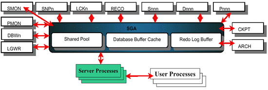 Oracle은 서버프로세스를 생성하여 접속된 사용자 프로세스의 요구 사항을 처리합니다. 서버 프로세스는 사용자 프로세스와의 통신과 사용자 프로세스의 요구 사항을 수행하는 Oracle과의 상호 작용을 담당합니다.