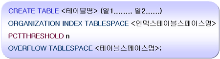 PCTTHRESHOLD : IOT를 위해서 예약된 공간의 백분율로, 1블럭의 N% 비율보다 큰 데이터가 입력되면 키 열이 아닌 데이터는 OVERFLOW TABLESPACE절에 정의된 테이블스페이스에 저장 됩니다.