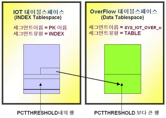 OVERFLOW 행조각을 수용할 테이블 : PCTTHRESHOLD를 초과한 경우 나머지 컬럼들이 저장되는 테이블로 이름이 SYS_IOT_OVER_n으로 지정되며 n은 DBS_OBJECTS에서 볼 수 있는 IOT의 OBJECT_ID입니다.