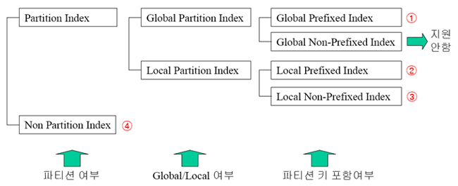 - 다른 칼럼을 사용하여 파티션 되는 경우에는 Global Non-Prefixed Index이지만, 오라클 에서는 Global Prefixed Index만을 지원 합니다.