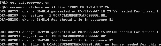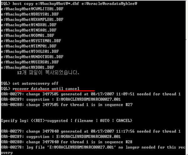위의 에러가 나기 전 시점인 2007-08-17:09:37:26초까지 데이터베이스를 돌린다. ARCHIVE를 자동으로 수행하기 위해서 SET AUTORECOVERY ON 명령어를 사용한다
