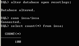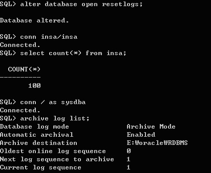 TIME-BASED를 이용 데이터베이스를 과거 시점으로 돌렸으므로, RESETLOGS로 OPEN한다.그런 이후 INSA 테이블이 존재 하는지 확인하고, ARCHIVE번호도 확인한다.