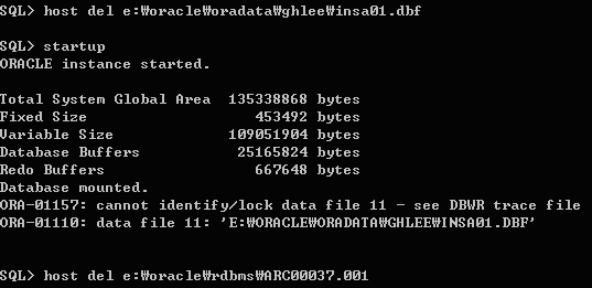 DB가 SHUTDOWN된 상태에서 INSA01.DBF가 손상되었고, ARC00037,001 ARCHIVE도 손상되었음. 현재 데이터파일이 존재 하지 않으므로 MOUNT 단계까지만 데이터베이스가 올라옴