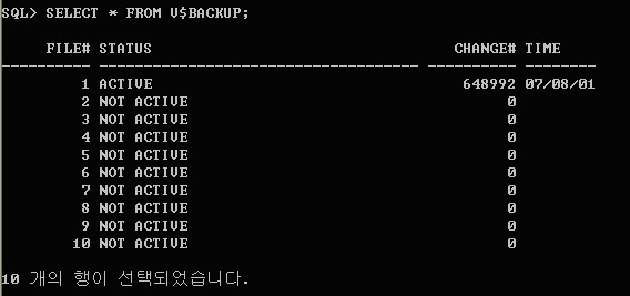 CHANGE#SCN(System Change Number)를 보여주는 Column이며 TIME은 BACKUP MODE에 있던 일자를 보여주는 컬럼 입니다. 위는 2007년 8월1일 File#가 1번인 File이 Online 백업 중 이라는 것을 의미합니다.