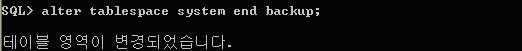 백업이 완료 되면 (COPY명령어로 인한 백업 작업이 완료 되었다는 명령어가 나오면은) 온라인 백업을 종료 합니다.