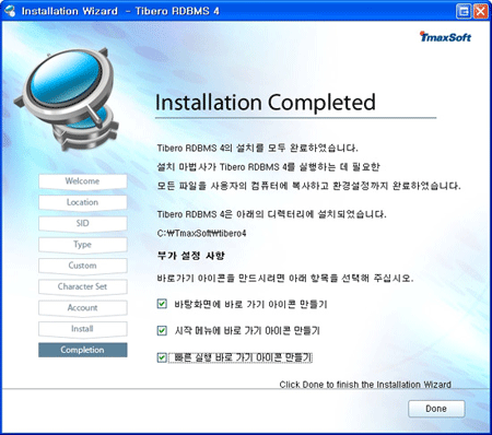 4. Tibero RDBMS가 정상적으로 설치되면 아래와 같은 화면이 나타난다. 생성하고자 하는 바로 가기 아이콘을 선택한 후, [Done] 버튼을 클릭하여 설치를 종료한다.