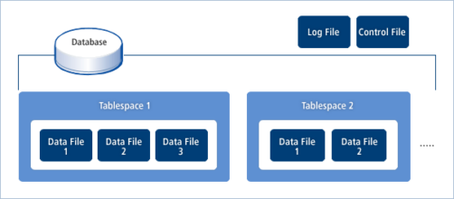테이블스페이스는 [그림 2]와 같이 물리적으로 여러 개의 데이터 파일(Data File)로 구성된다. Tibero RDBMS는 데이터 파일 외에도 컨트롤 파일(Control File)과 로그 파일(Log File)을 이용하여 데이터를 저장할 수 있다.