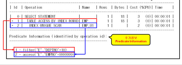 이 때 각각의 실행계획에 참여하는 조건들을 Predicate Information에서 확인할 수 있으며 Id 2번에서 'E.EMPNO = 9999999' 조건을, Id 1번에서 나머지 조건 'E.DEPTNO = 10' 조건이 필터되는 것을 확인할 수 있다.