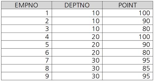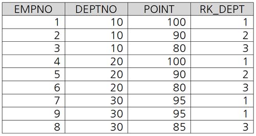 RANK() OVER(PARTITION BY DEPTNO ORDER BY POINT DESC) AS RK_DEPT