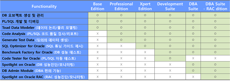 Oracle 데이터베이스 환경에서 사용하는 Toad for Oracle은 Base Edition, Professional Edition, Xpert Edition, Development Suite, DBA Suite, DBA Suite RAC Edition 이렇게 6가지 제품군으로 구성되어 있습니다.