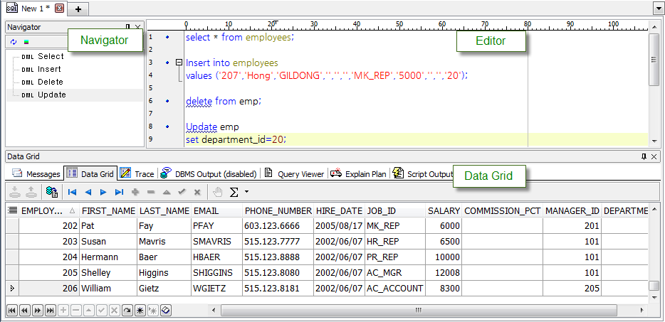 SQL Editor는 SQL을 작성하고 편집할 수 있는 Editor 화면과 그 결과를 확인할 수 있는 Data Grid, 그리고 활성화된 Editor창의 SQL정보를 간략하게 표시하는 Navigator 이렇게 세가지 화면으로 이루어져 있습니다.