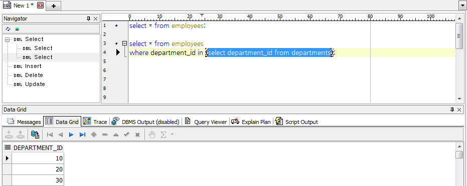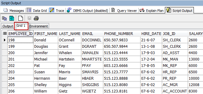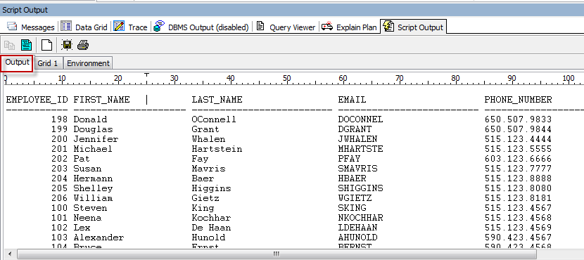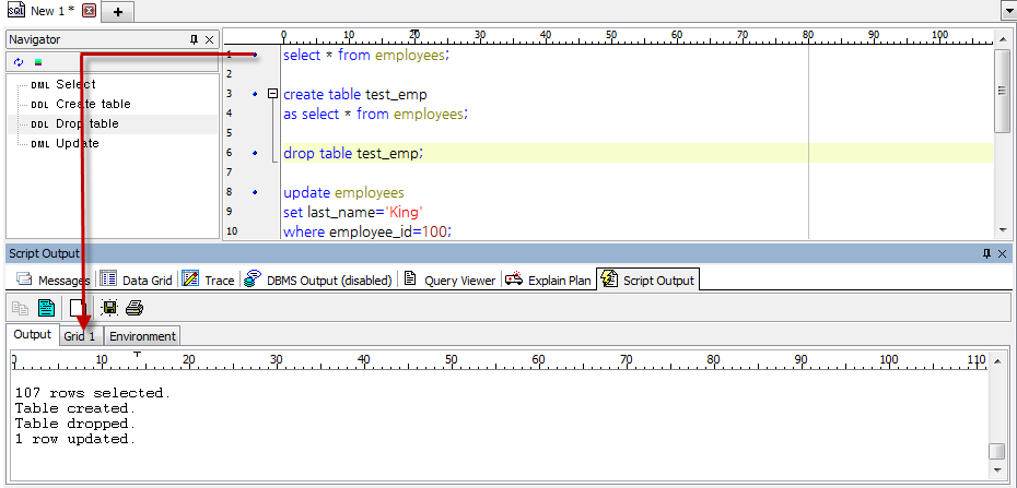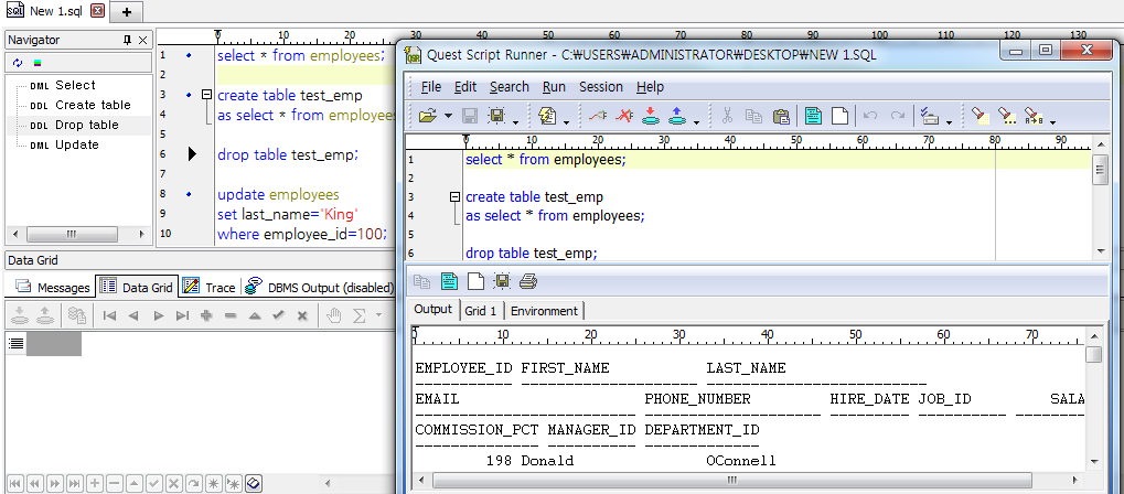 스크립트 형태로 실행이 되며, 여러 개의 SQL 문장을 동시에 실행 할 수 있습니다. Select문 같은 조회 쿼리를 실행하면 조회 결과를 Output 탭에서는 스크립트 형태로 보여주고, Grid 탭에서는 Grid형태로 보여줍니다.