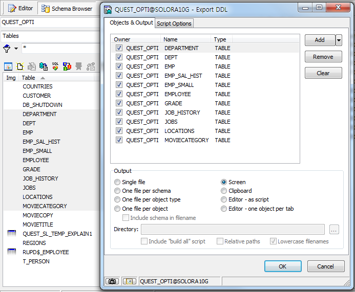 아래 그림처럼 여러개의 Object를 선택하여 다수의 Object 스크립트를 한번에 생성 할 수 있고, Script Option에서 Drop statement, Schema name 정보 또는 Tablespace 등 다양하게 Script를 만들수 있고, 해당 Table이 가지고 있는 데이터에 대해서 Insert 문장을 만들 수 있습니다.