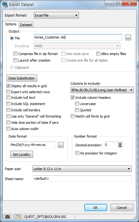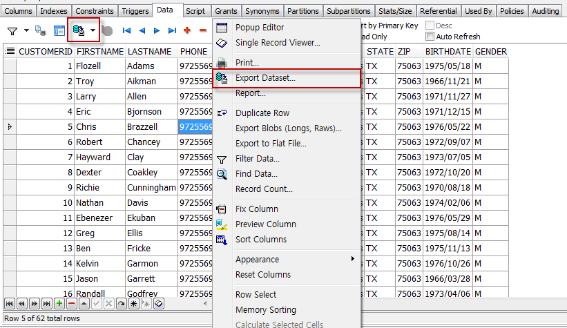 데이터 그리드 화면에서 마우스 오른쪽 버튼을 클릭하여 Export Dataset을 선택하거나, 위쪽 툴바에서 아이콘을 클릭하여 조회한 Data를 Excel, HTML, SQL 문장, SQL Loader 등 다양한 형식으로 저장 할 수 있습니다.