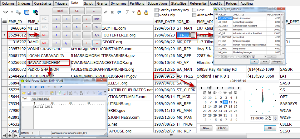 아래 그림과 같이 각 컬럼의 DATA TYPE 마다 날짜 변경 화면, 계산기, 텍스트 변경 화면 그리고 Foreign Key 참조 테이블의 Data를 선택할 수 있는 화면 등 Data를 쉽게 변경할 수 있도록 다양한 화면을 제공하고 있습니다.