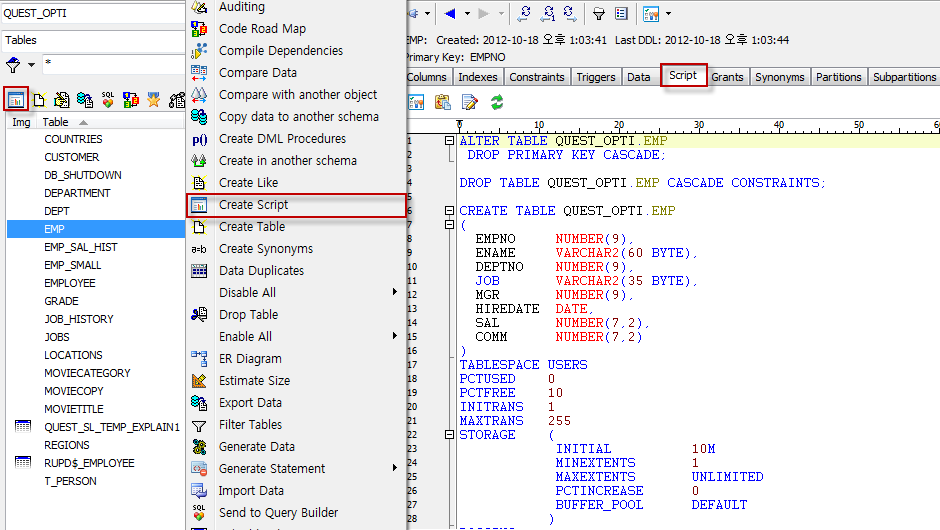 오브젝트 패널의 Create Script 또는 상세 패널의 Script탭을 통해서 각 Object의 DDL Script 및 Insert Script를 제공하고 있습니다.