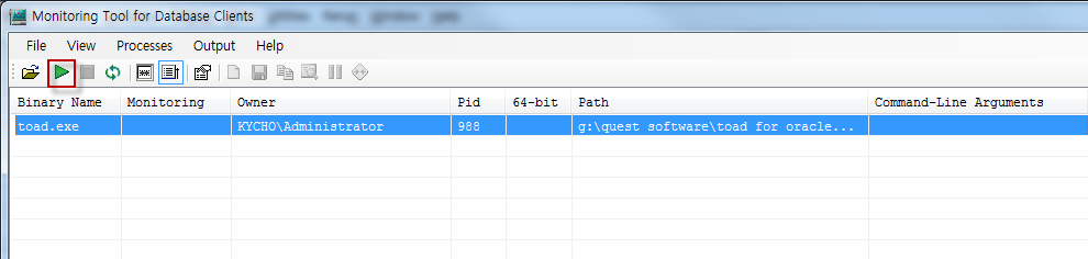 SQL Tracker를 실행 한 후 녹색 화살표 아이콘을 클릭하면 Toad를 사용하여 Database에 수행되는 SQL 문장을 SQL Tracker에서 확인할 수 있습니다.