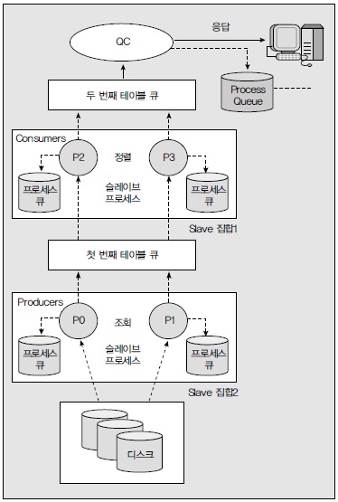 이와 같이 2개의 프로세스에 의해 액세스된 각각의 데이터는 액세스가 종료된 후에 해당 SQL을 수행한 프로세스에게 그 결과를 제공하게 되며 해당 SQL을 수행한 프로세스는 그 결과를 취합해 최종 결과를 화면에 추출하게 된다.