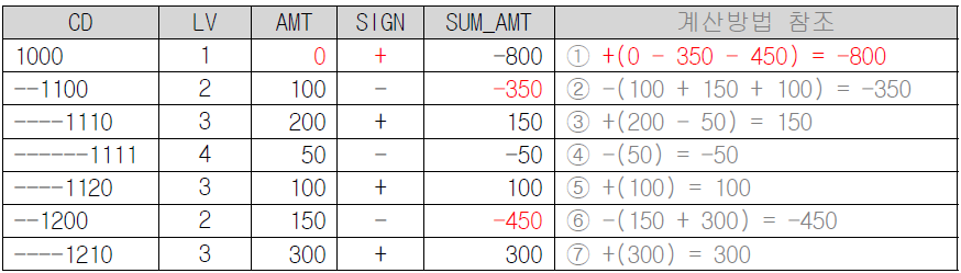 정리해보면 부호의 연결경로인 SIGN_PATH를 구하고 -부호를 제거한뒤 길이를 구해, 그값을 2로 나눈 나머지가 0이면 양수(1), 1이면 음수(-1)을 각 하위코드의 금액에 곱해주고 그 값들을 모두 합산하면 되는 것입니다.