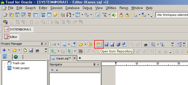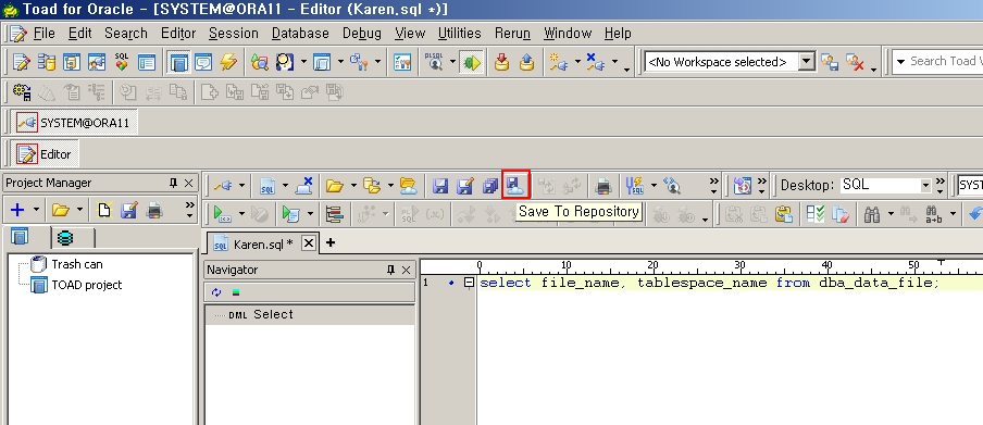 Toad World Repository에 스크립트를 등록하려면 다음과 같이 진행합니다. Toad Editor창에 스크립트를 열고 도구 모음에서 ‘Save to Repository’ 를 누릅니다.