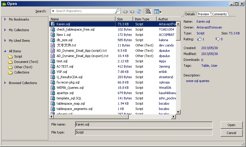 Toad World Repository이 실행되면 기존의 스크립트를 확인할 수 있습니다. 파일을 선택하면 관련된 정보를 보여주고 Like, Dislike, Bookmark 등을 수행할 수 있습니다.