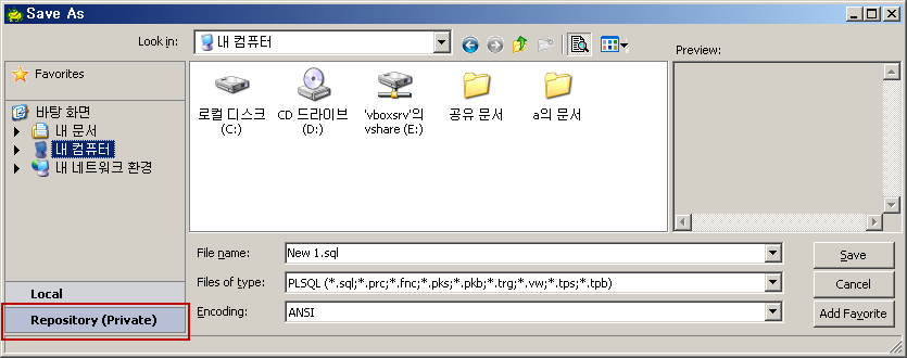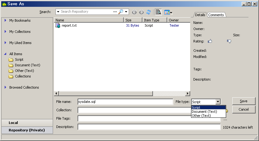 File > Save As로 이동하여 Repository (Private) 선택 후 file name 및 type을 선택하고 저장합니다