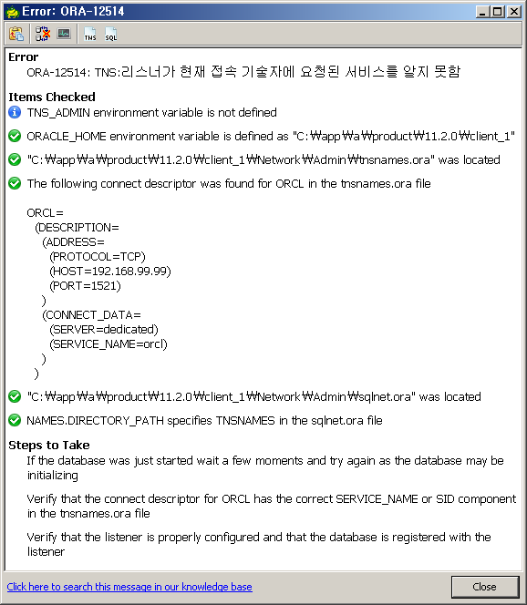 • 예1) DB접속 정보에 입력한 식별자(Alias)가 TNS에 없는 경우