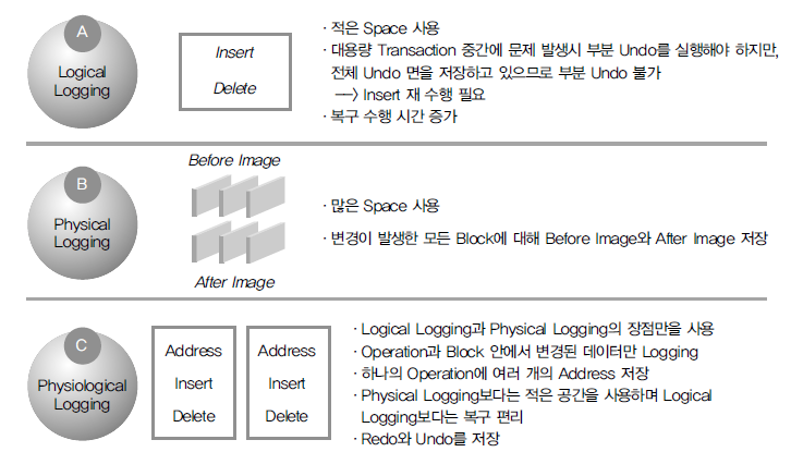 | Logging 방식 | - Before Image + Ater Image | - 작업 명세서로 표시(OP Code 이용) | - Before Image + Ater Image - 작업 명세서로 표시(OP Code 이용) |