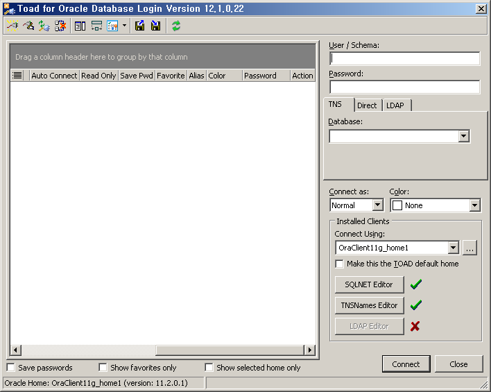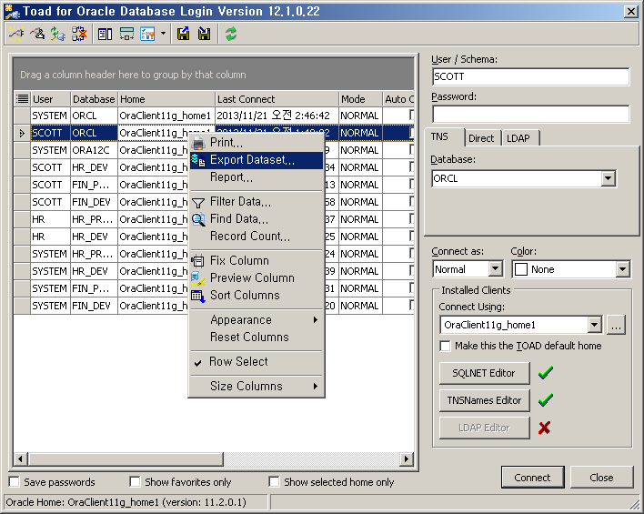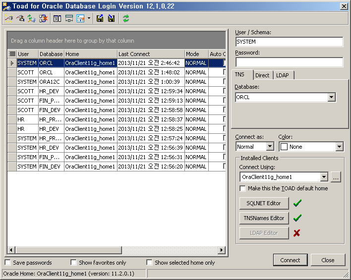 Toad를 이용해서 DB에 접속하면 관련 접속 정보를 자동으로 기록합니다. 이 정보는 DB 접속을 위해서 Login 창 열면 Login 목록에 나타나고 해당 커넥션 정보를 클릭하면 재사용할 수 있습니다. 패스워드를 저장한 경우에는 패스워드 입력 없이 클릭만으로 접속 가능합니다.