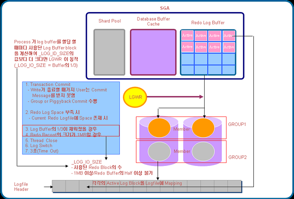 Redo Log Buffer는 다음과 같은 경우에 LGWR에 의해 Redo Log Buffer의 Active한 영역을 Redo Log File에 기록하게 된다.