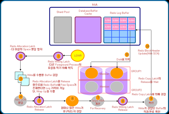 이와 같은 절차를 수행해 LGWR은 Redo Log Buffer의 Buffer를 Redo Log File에 기록하게 된다.