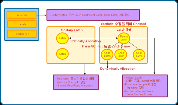 이와 같은 이유에서 Redo Allocation Latch는 Solitary Latch이며 Redo Copy Latch는 Latch Set에 해당 하게 된다. 물론 LGWR을 기동시키는 Redo Writing Latch는 하나만 존재해 LGWR을 기동하기 때문에 Solitary Latch에 해당한다.