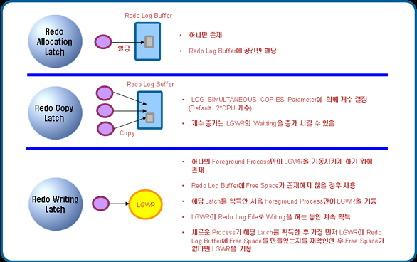 Redo Log Buffer는 [그림 2]와 같이 세 가지 형태의 Latch가 존재한다. 그럼 각각의 Latch에 대해 확인해 보자.
