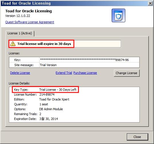 Toad를 처음 실행하면 다음과 같은 Trial License 현황을 보여줍니다.