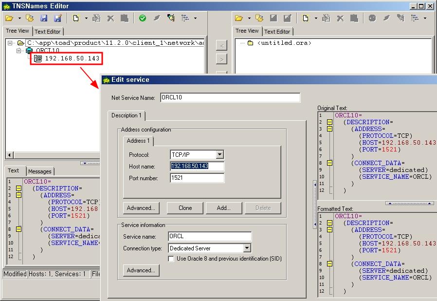 TNSNames Editor는 Tree View와 Text Editor 두 가지 모드로 확인 및 수정이 가능합니다. Tree View에서는 다음과 같이 확인이 가능하며 IP를 더블 클릭해서 정보를 수정할 수 있습니다.
