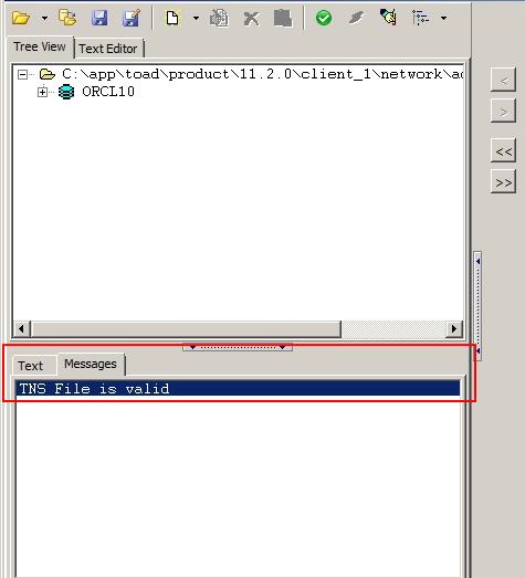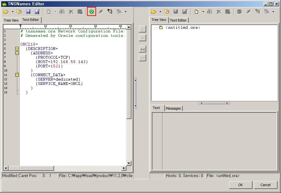 TNSNAMES.ORA를 추가 또는 수정할 때 공백이나 띄어쓰기, 괄호 등의 문법에 민감합니다. 따라서 Toad에서는 TNSNAMES.ORA에 대해 Syntax Check 기능을 제공합니다. 오라클 서버의 정보를 추가 혹은 수정 후 저장을 하고 을 누르면 문법 체크를 해줍니다.