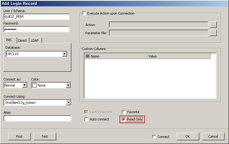 Toad를 접속하는 창에서 Read Only 모드로 접속할 수 있습니다.