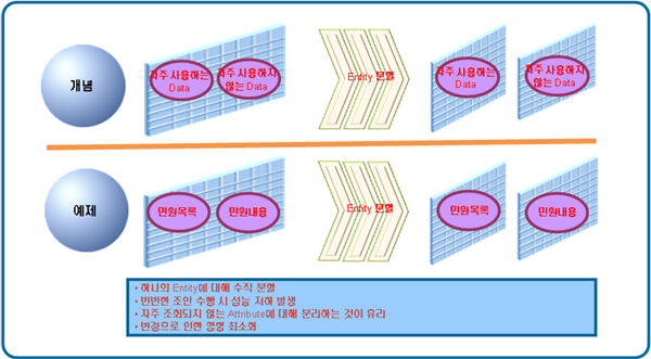 예를 들면, 민원 목록까지는 자주 조회하고 민원 내용은 자주 조회되지 않을 경우 1:1 OR 0 분할을 고려해 1:1 OR 0 분할을 수행한다면 두 테이블을 조인할 경우 OUTER 조인이 수행될 가능성이 높다. OUTER 조인은 실행계획이 고정돼 유연성이 없게 된다.