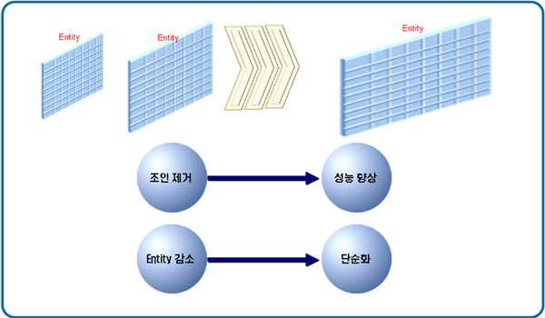 이와 같은 점에 의해 근본 Entity의 경우에는 많은 통합도 가능하지만 중심 Entity의 경우에는 적게 통합하는 것이 유리하다. Entity의 Primary Key가 동일하며 각 Entity가 가지고 있는 Data가 유사하다면 하나의 Entity로 통합할 수 있다.