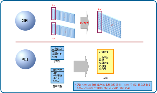 이유는 정직원 Data에 대해서는 소속사 Attribute 값이 존재하지 않으며 그렇기 때문에 Varchar로 선언해야만 저장 공간을 차지하지 않기 때문이다. Primary Key가 서로 다르지만 Data에 대해 동질성을 가지고 있다면 하나의 Entity로 통합할 수 있다.
