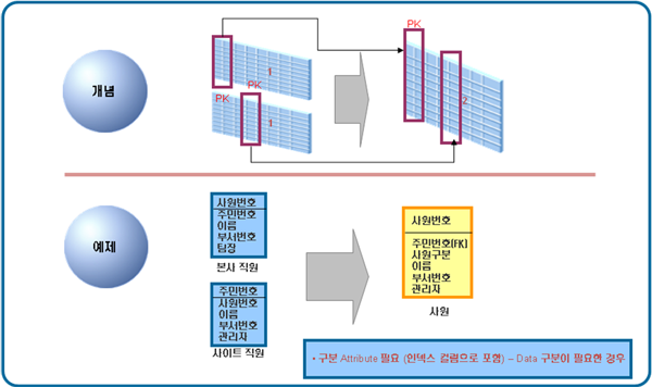 [그림3]의 예제처럼 2개의 Entity를 통합하게 되면 정직원인지 또는 협력직원인지를 구분할 수 있는 Attribute가 필요하며, 해당 Attribute를 보통 구분 Attribute라고 한다.
