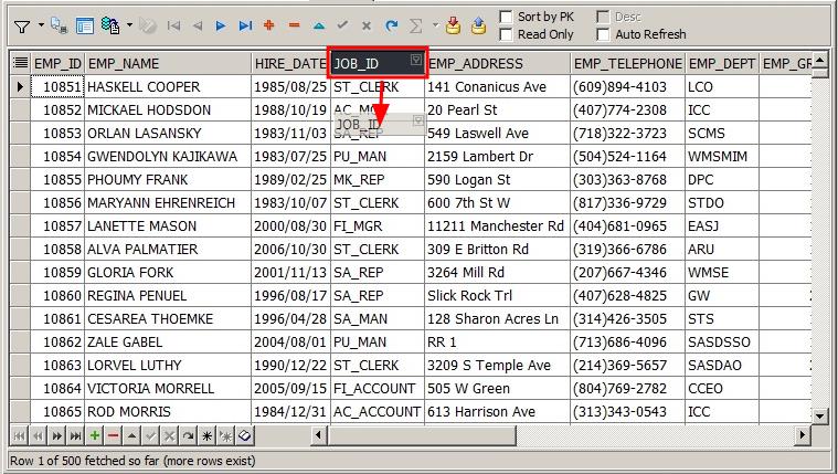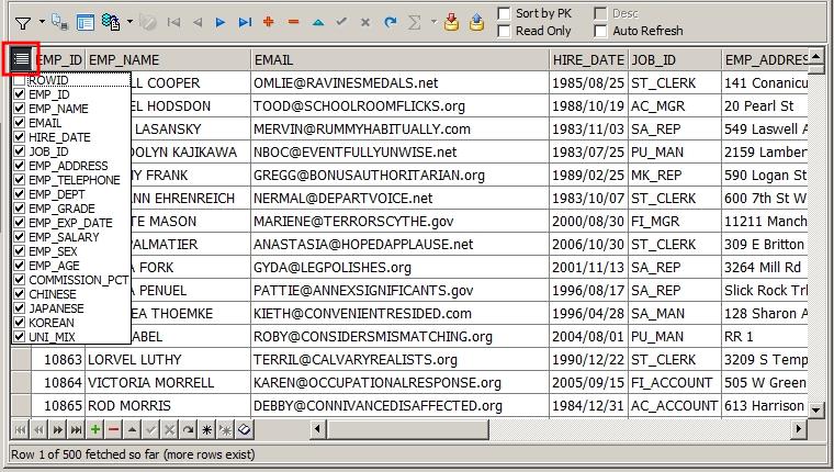 Toad는 컬럼 숨기기 기능을 이용하여 많은 양의 데이터를 효과적으로 조회할 수 있습니다. Data Grid 창에서 불필요한 컬럼까지 조회가 되어 데이터 양이 많아질 때 자주 사용하는 방법입니다.