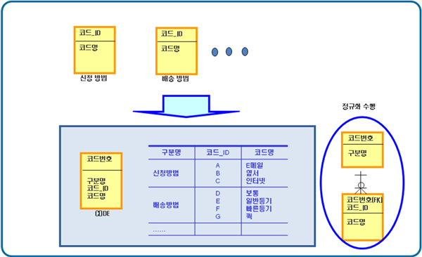 이와 같이 구성한다면 모든 코드 값을 하나의 엔티티에서 관리할 수 있을 것이다. 이 경우 코드 엔티티에서 구분명 Attribute의 경우에는 중복된 데이터를 저장하게 되므로 근본 엔티티로 분할할 수 있게 된다. 물론 이 과정을 정규화라고 한다.