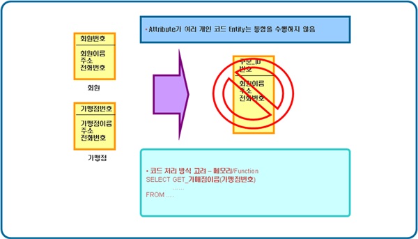 [그림1] 복잡한 관계로 인한 두 가지 문제점 위와 같은 이유에서 코드 엔티티는 데이터의 정합성을 높이면서 최소의 개수로 엔티티를 도출해야 한다.