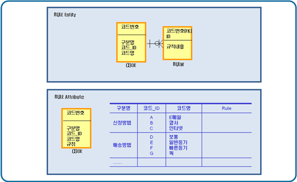 • - RULE Attribute 추가 : 하나의 코드 값에 하나의 Rule만이 존재한다면 Rule 엔티티와 Rule 엔티티를 통합해 Attribute로 구현할 수 있다. 각 코드에 Rule이 하나만 존재한다면 이와 같은 방법을 사용할 수 있다.