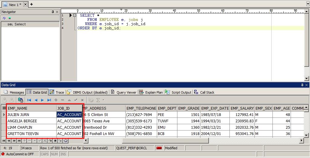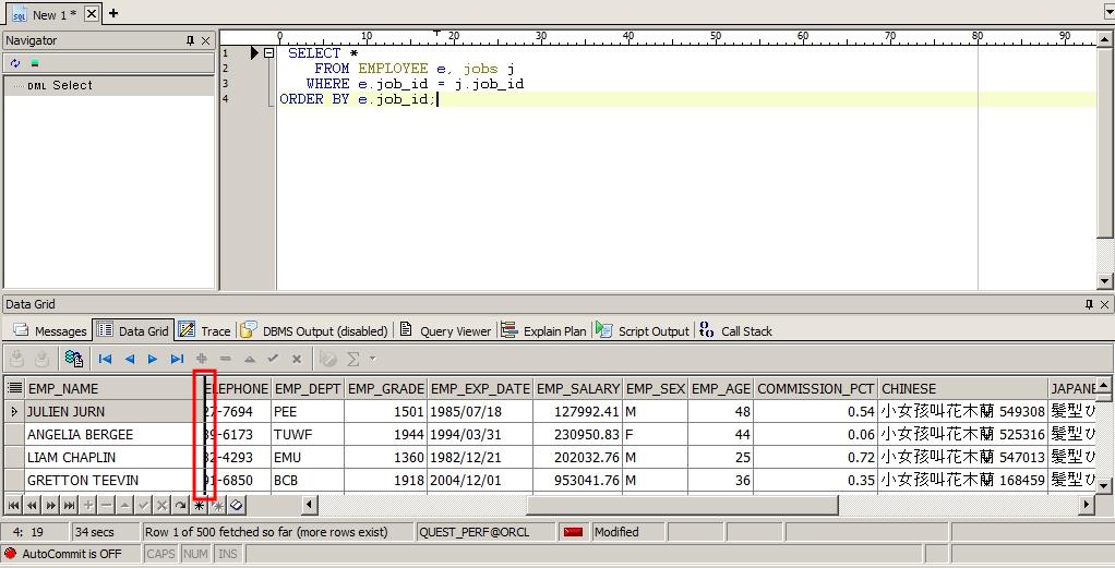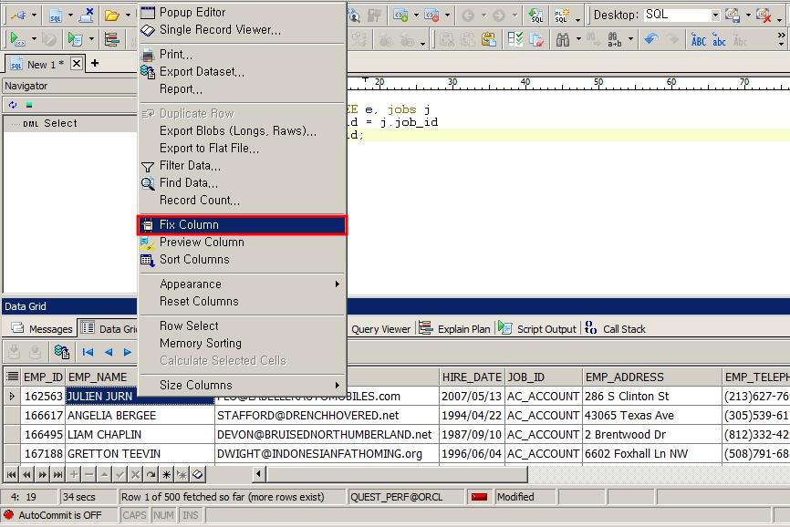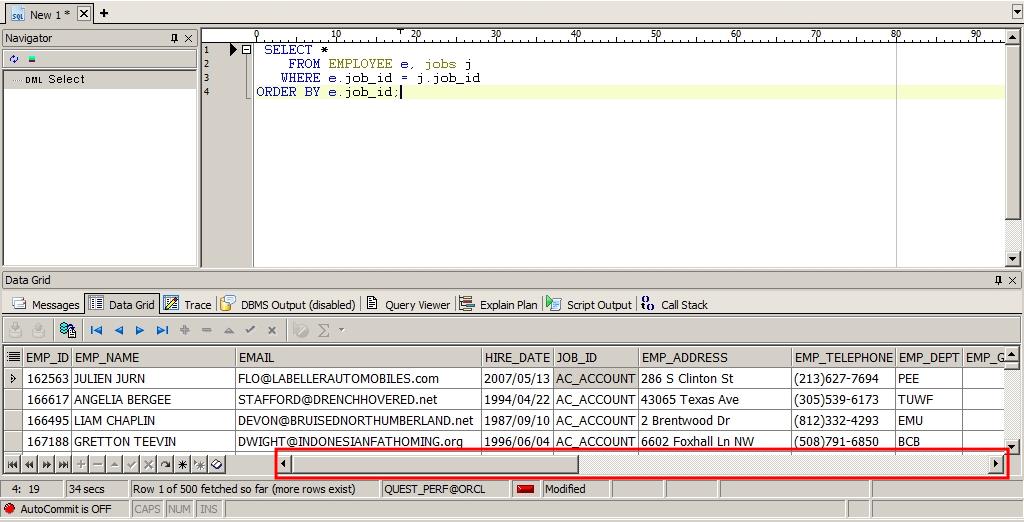 Toad는 컬럼이 많은 데이터를 조회할 때 효과적으로 보는 방법으로 틀 고정 기능을 제공하고 있습니다. 컬럼 수가 많으면 아래 그림처럼 가로 스크롤이 생기게 되고 한번에 컬럼을 다 보기 힘들게 됩니다.