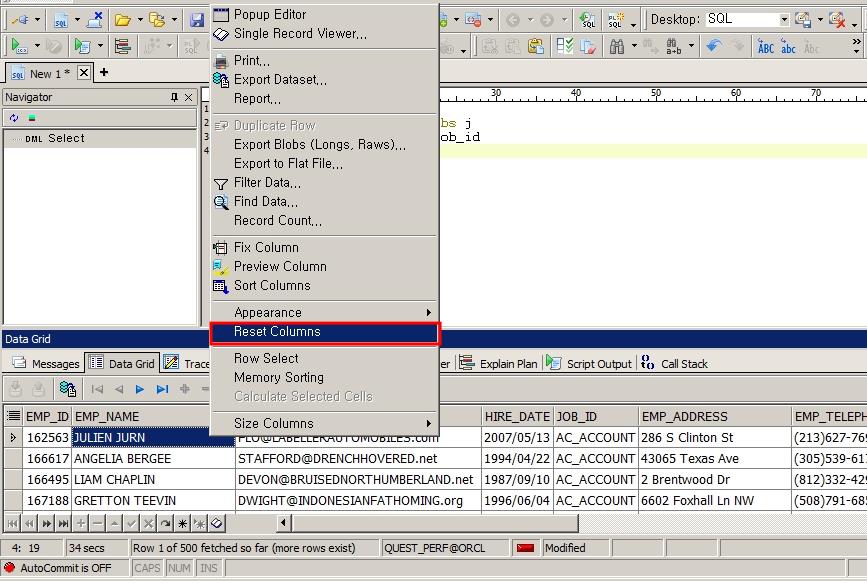 틀 고정을 해제시키려면 Data Grid에서 마우스 오른쪽 버튼을 눌러 Reset Columns를 선택합니다.